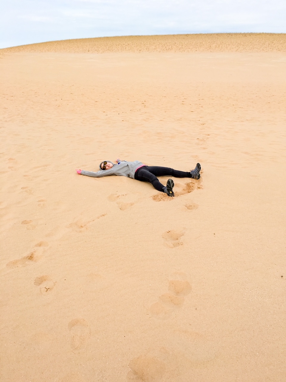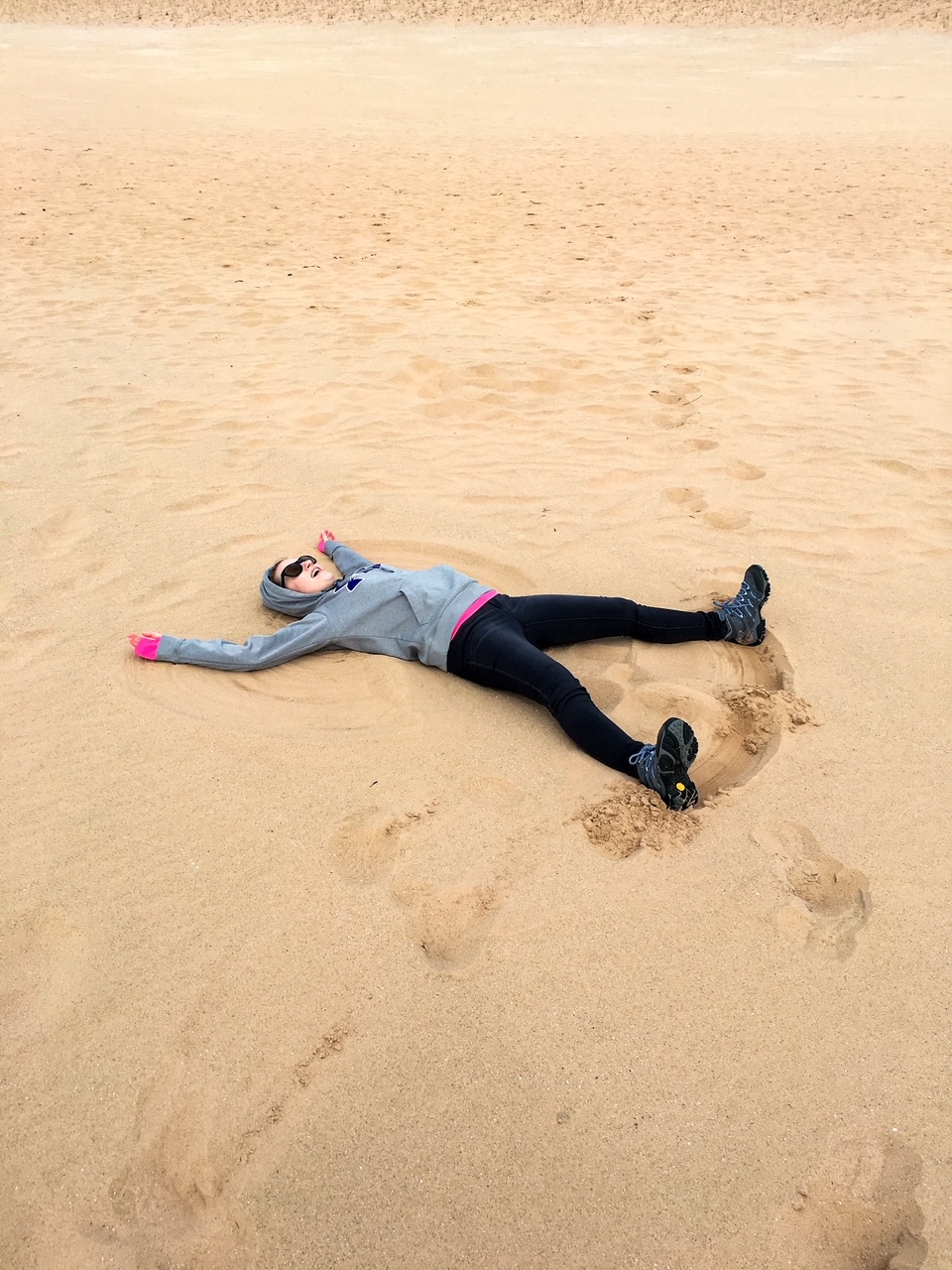 Seeing all the sand inspired me to pause and make a sand angel. Tony, of course, was amused with my antics. If he can wear loafers to hike in sand, I can make sand angels.