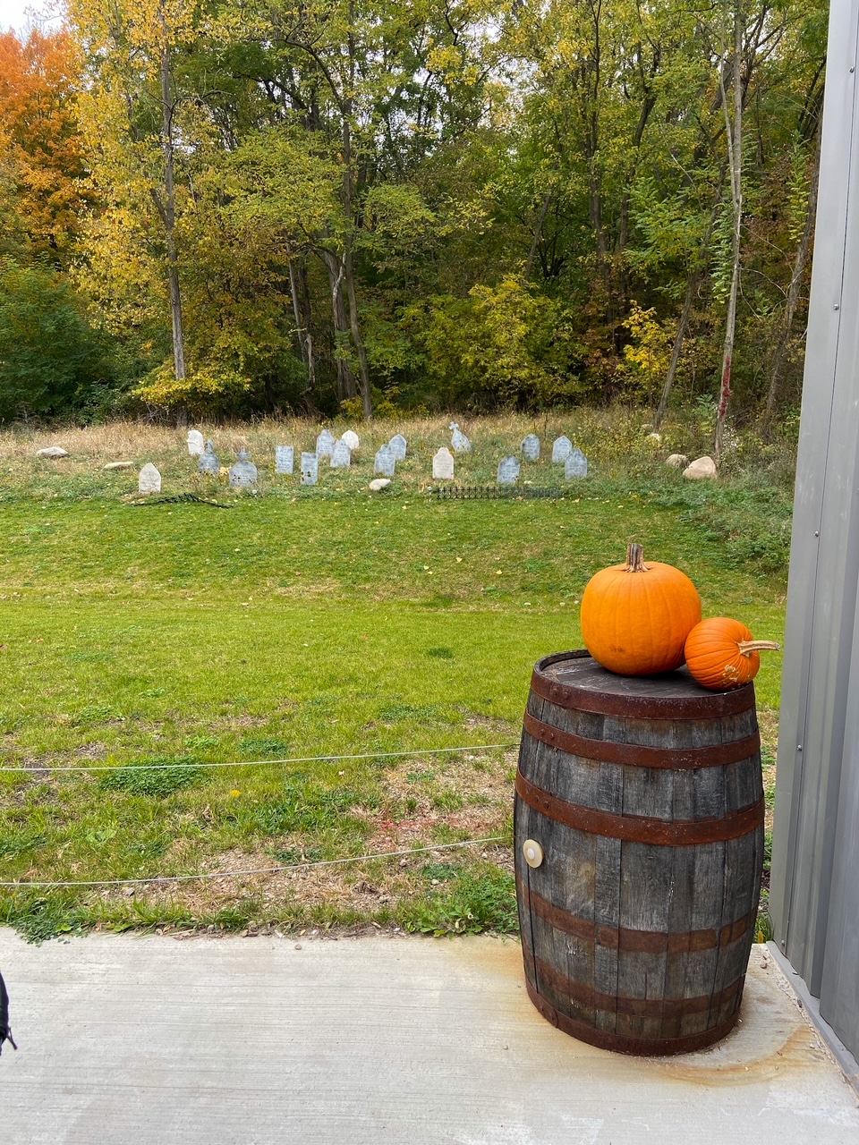 Third Nature has a huge back patio area with plenty of seating options – traditional patio seating, picnic tables, and chairs pulled up around fire pits. The brewery’s style is nature meets industrial. The primary focus is the trees surrounding the brewery and hops trellis’ near the patio and parking lot. Even if you sit inside, the floor to ceiling windows bring the outside in. Because we visited in October, the patio and outside was decorated for fall. There was even a fake graveyard with headstones of former celebrities!