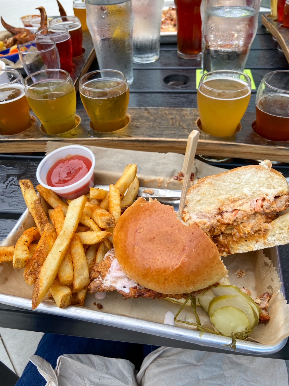 Now for the food! I loved the hot chicken sandwich – the flavor is perfect and paired well with all my non- spicy beers! My sister ordered the wings and a side of fries while my mom ordered the sausage soup. Finally my dad (he tagged along to drive us around) ordered the porky pig flatbread pizza. Everyone liked the food they ordered so all in all a great experience!