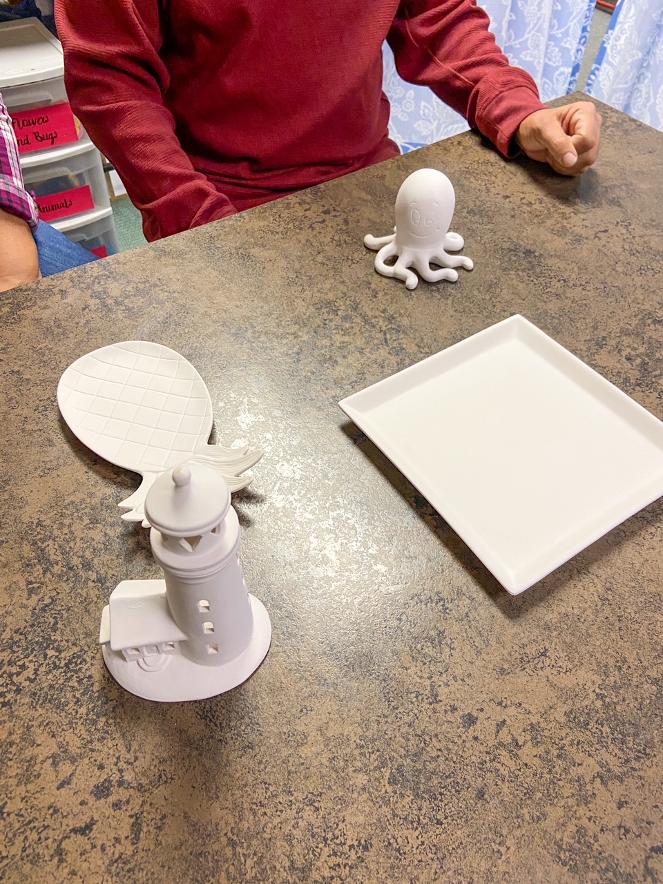 Step one involved picking out which ceramic to paint. The pricing is located on a sticker under each choice. There are plenty of options to choose from – big, small, expensive to under $10. I decided to paint a lighthouse, and my family chose to paint a pineapple tray, square plate, and octopus.