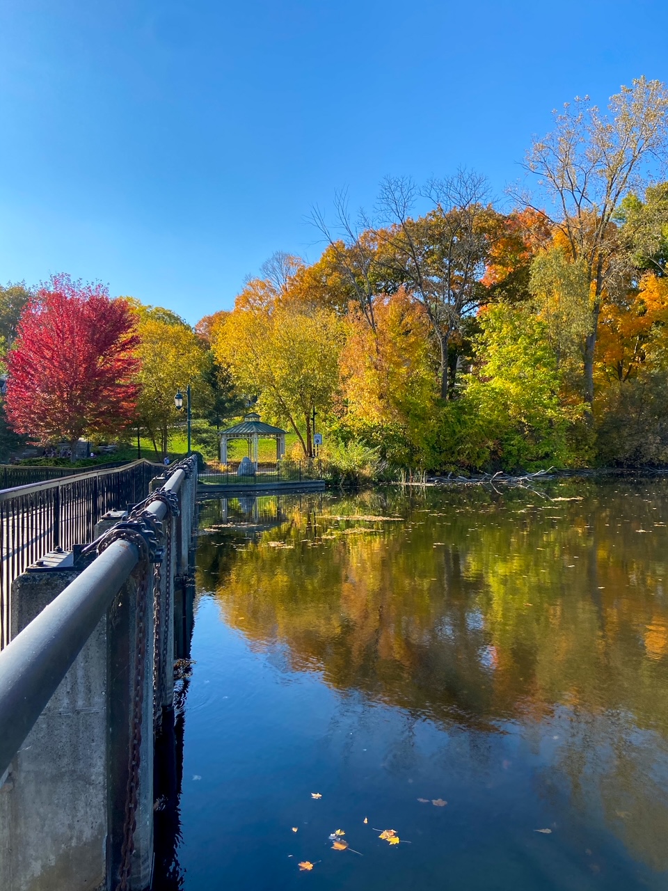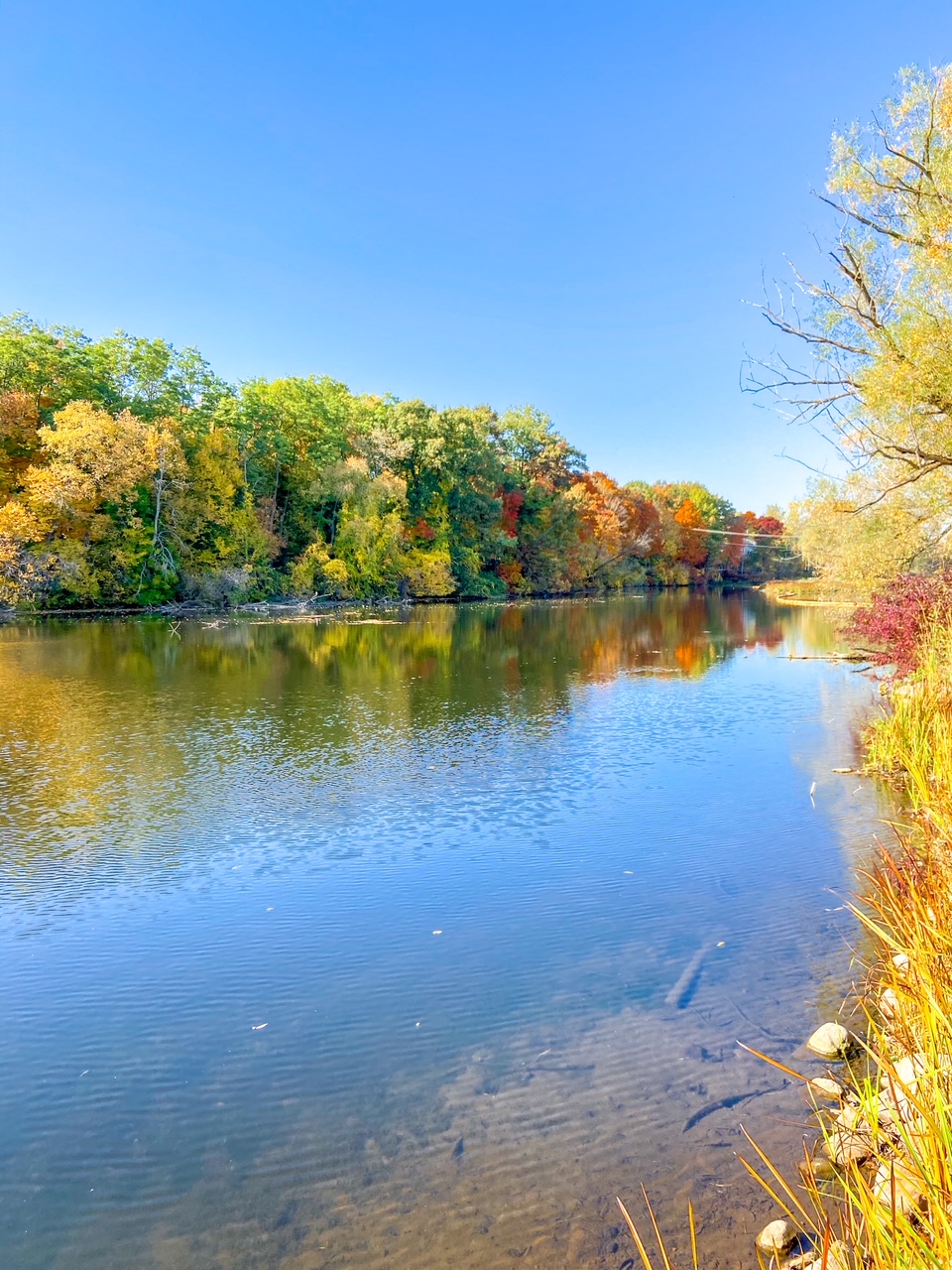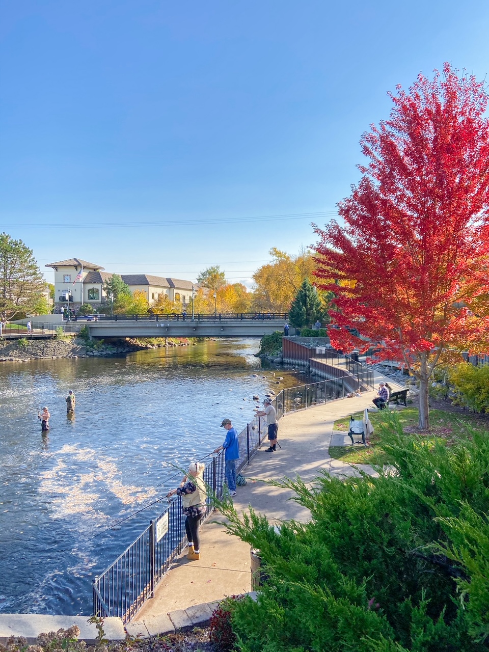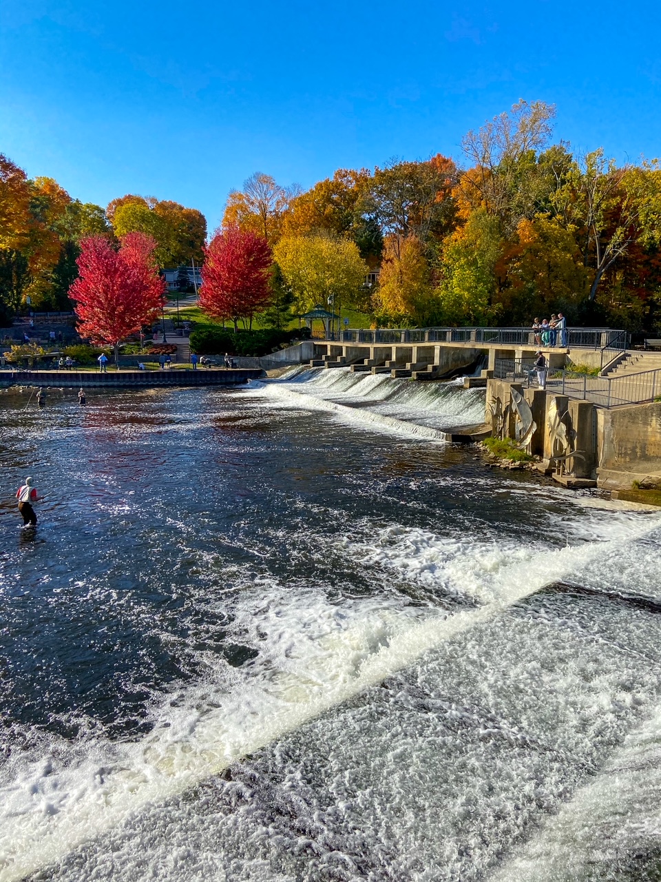 Our first stop downtown was to the Rockford Dam Overlook. Here you can stop and watch the man made waterfalls, fishermen trying to catch something, or even just take in the beauty along the Rouge River. When we visited, it was near peak fall color and the trees lining the river were beautiful to look at.