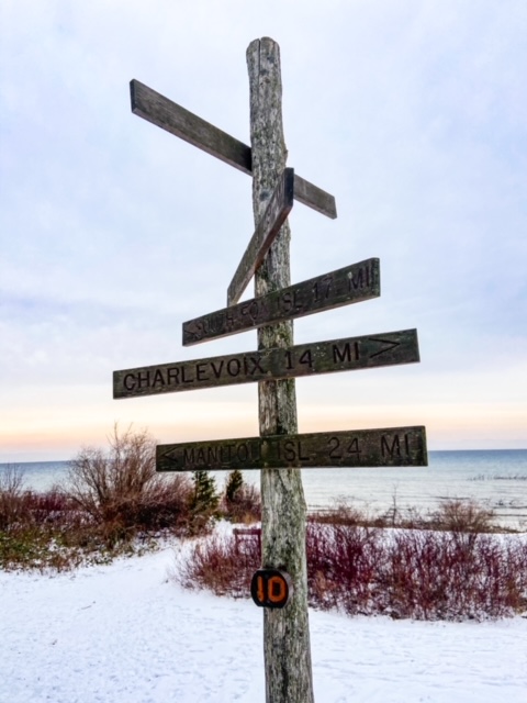 Our next stop was to Omena, which translated into English from Ojibwe mean’s “Really? Is that so?” While here, we pulled into the Leelanau Cellars parking lot to stop and check out the lake. We originally intended to stop at the 45th parallel park to get our picture taken with the sign. However, there was too much snow in the park so we decided to save it for another time.