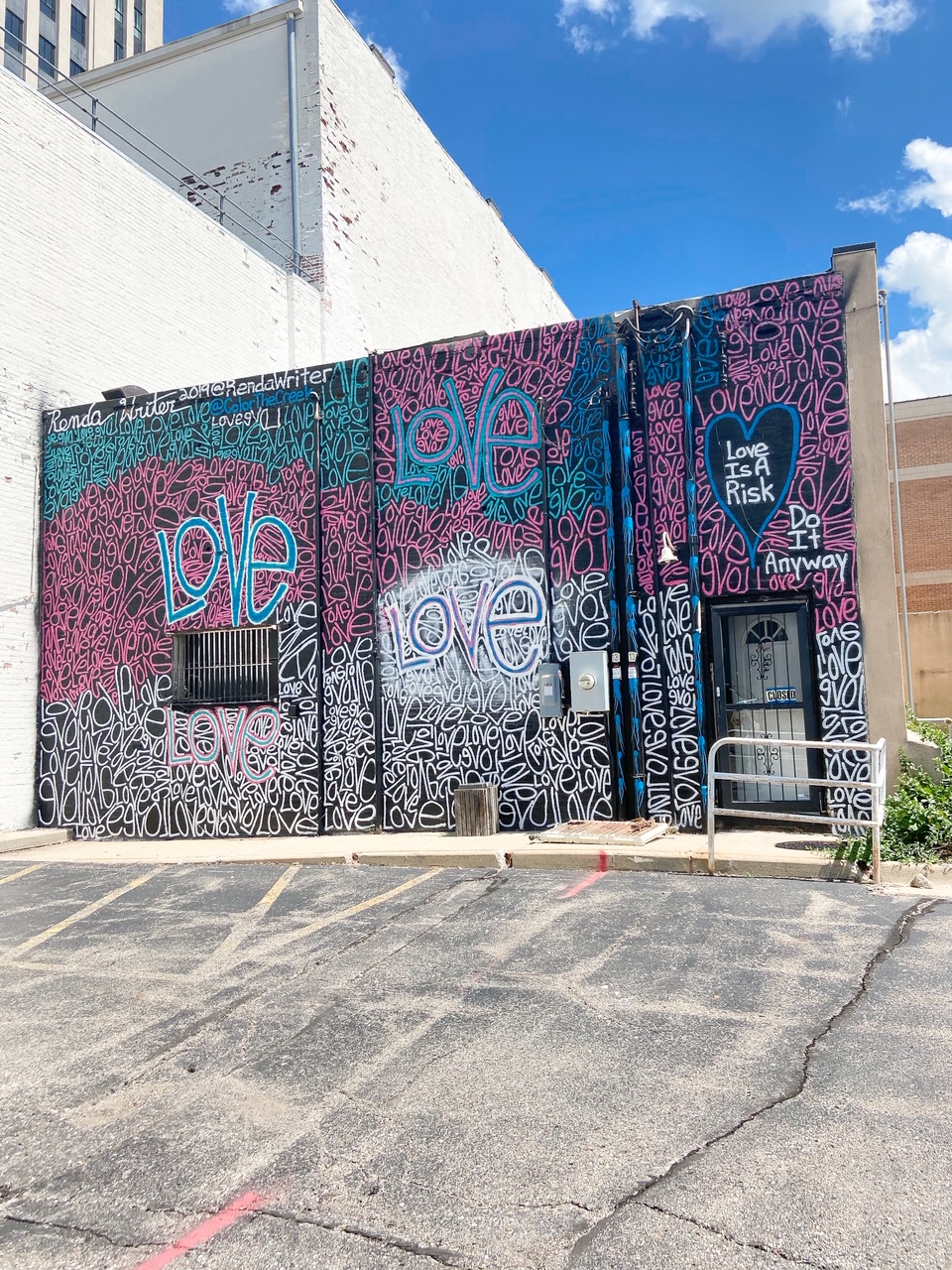 During our time downtown, we stopped to admire the Sojourner Truth mural by Sintex. The Truth mural is the first ever Color the Creek mural from 2016. On either side of Truth, there are 2 other murals. To its right is Renda Writer’s Love mural. To its left is a piece by calligraphy artist Tubs, who overcame an illness to make this piece during the 2018 Color the Creek. All three murals are vibrant and add positivity to this corner of town. The murals are visible from Mill Rice Park which adds a great backdrop to the playground.