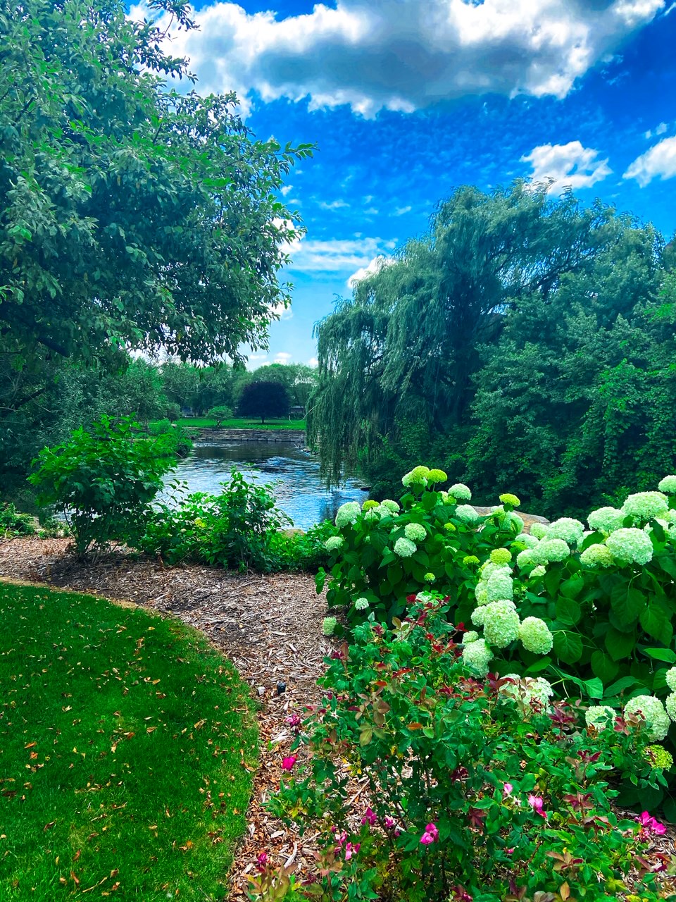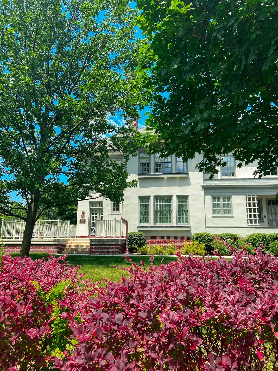 Once we finished lunch, we continued to meander along the Battle Creek river walk right where we left off at Clara’s. Once we crossed Capital Ave, we saw some beautiful rose and hydrangea bushes across the river from the Kellogg Foundation. As we continued along the path, we stumbled upon the W.K. Kellogg House.