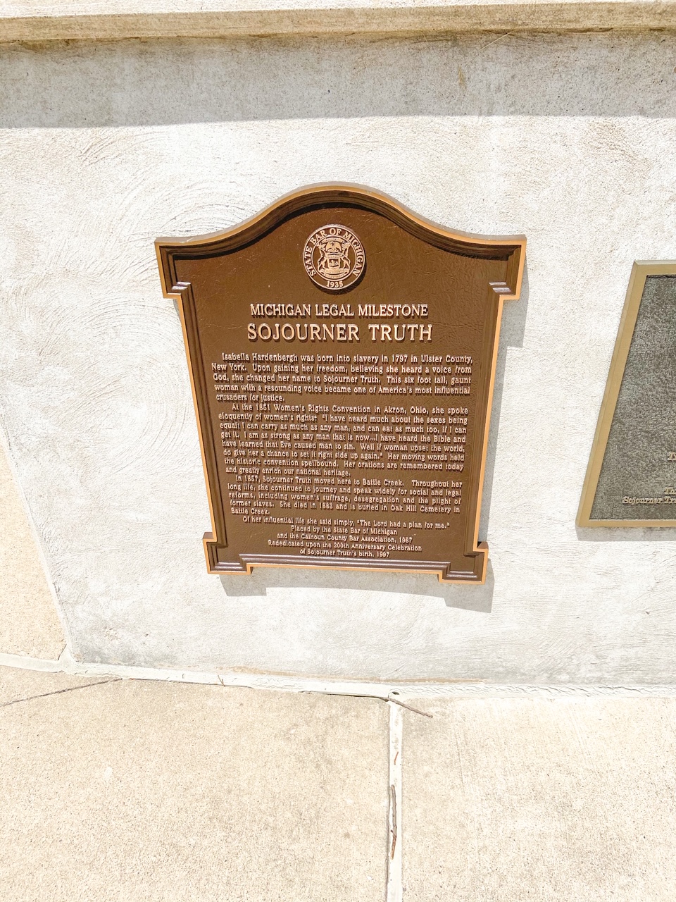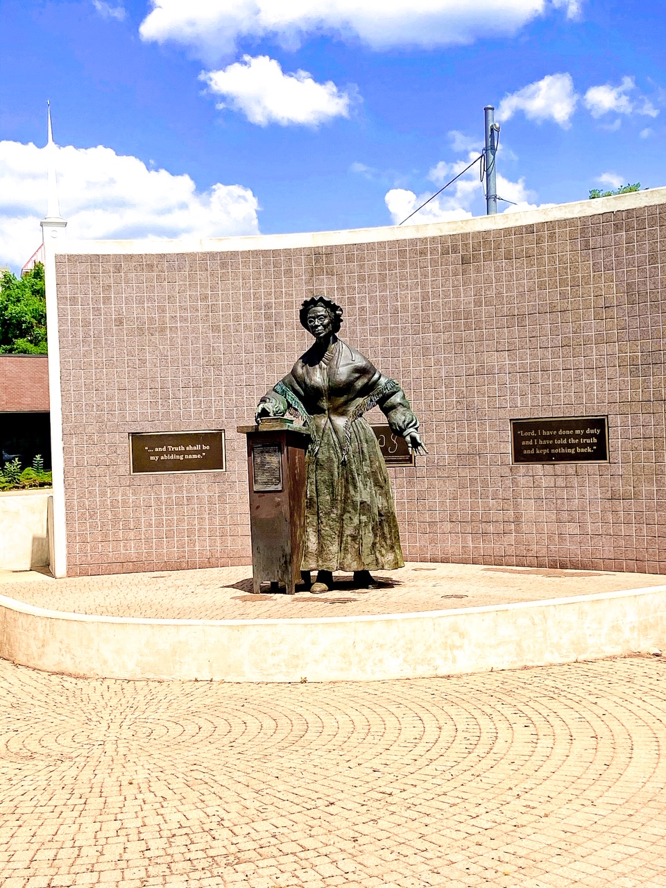 The most remarkable part of the park is the Sojourner Truth monument by artist Tina Allen. It features a 12-foot tall Truth at a lectern posed as if she was delivering a speech. When Truth was alive, she used her natural gift for public speaking to fight for abolition and suffrage. As we walked up to her in the mini amphitheater, we could imagine her delivering a passionate speech demanding the end to systemic racism that lingers to this day.