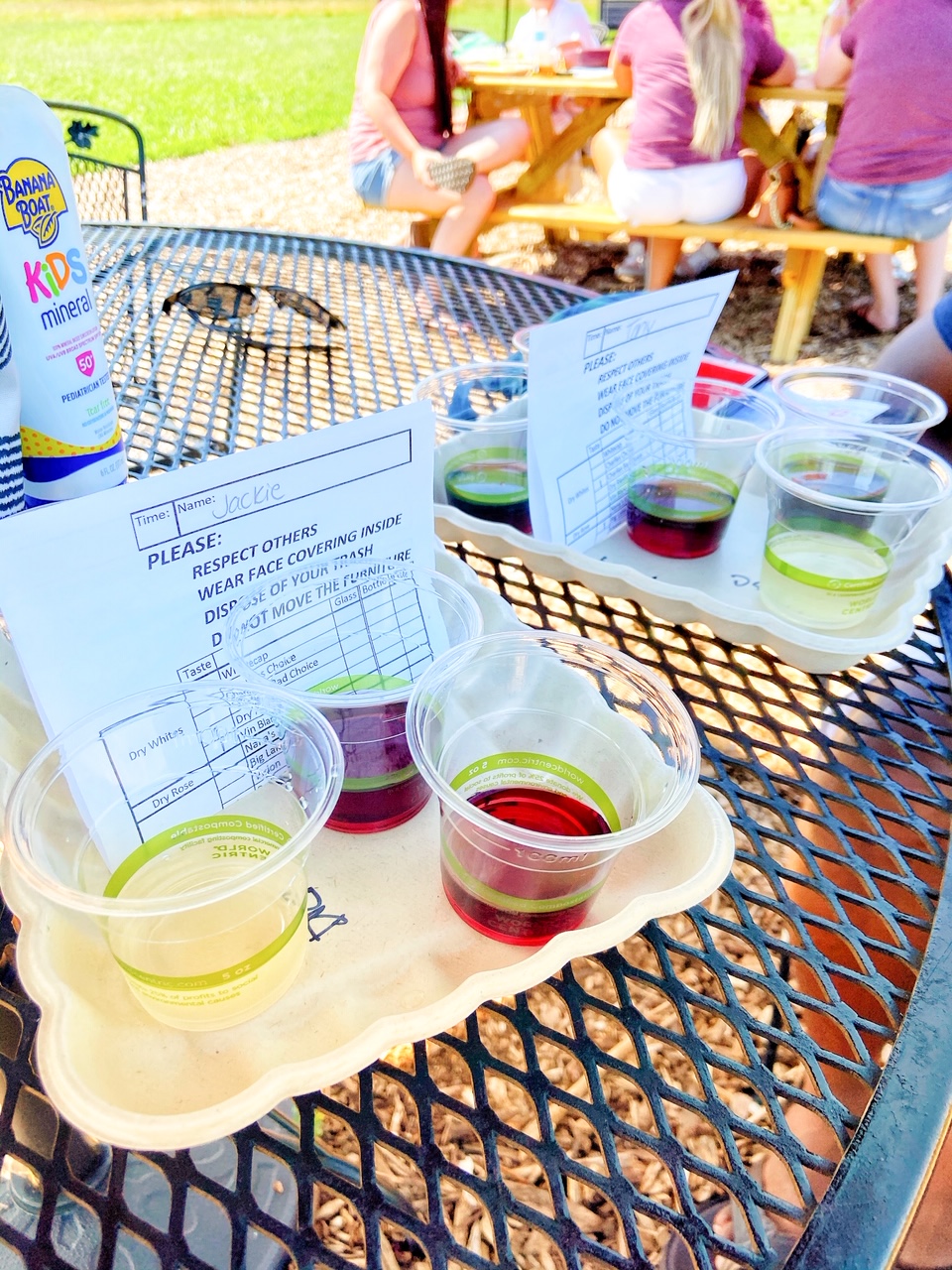 When we visited, we both did a wine tasting, which was a little different due to COVID. We were given a disposable, paper menu and pencil where we indicted the wines we wanted to try. Then, one person from the party takes the menu to the bar where the samples are poured in compostable cups.